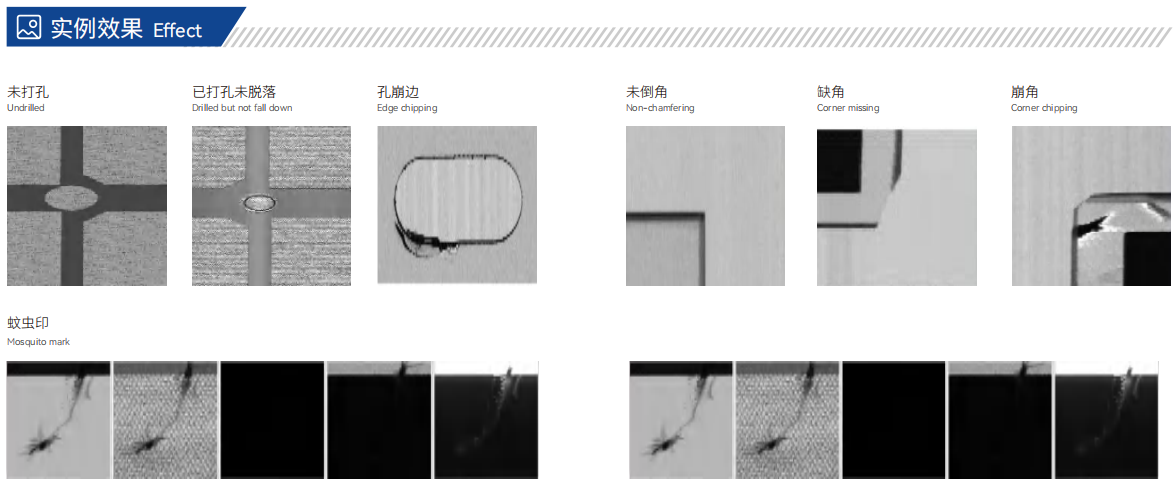 | 孔未穿/未打孔 Unthrough holes/unfinished holes | 可檢出,孔未打穿報警提示功能 Can be detected, with hole not drilled with alarm prompt function | |