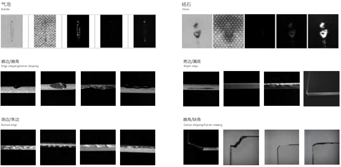 絲印玻璃除了絲印缺陷外,對臟污,劃傷類缺陷檢測能力達到90%;同時對玻璃缺邊,缺角也可以進行檢測;